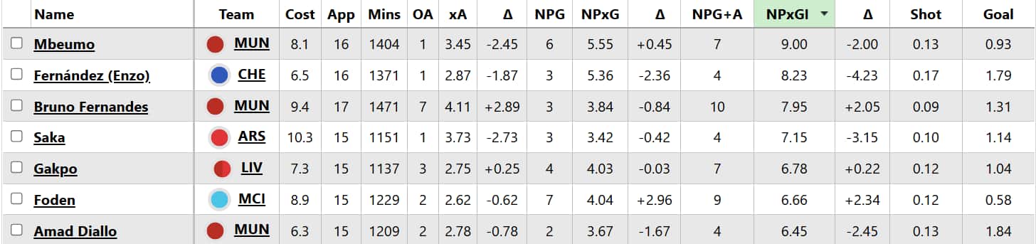 Bukayo Saka (£10.3m) tested patience last time out after passing up penalty duties. Even so, the underlying data remains encouraging. His non-penalty expected goal involvement continues to outstrip that of most midfielders, reinforcing his long-term appeal despite recent frustration.