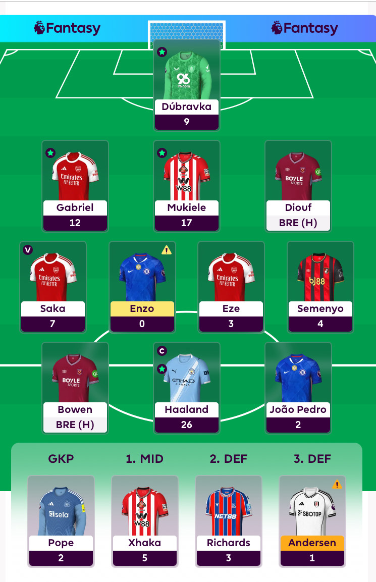 Tom lived up to his reputation as being more differential, choosing the right time to bring in Nordi Mukiele (£4.1m) and possibly the wrong time to double up on West Ham as El Hadji Malick Diouf (£4.4m) joins Jarrod Bowen (£7.8m). He is also the only one to have a twin Arsenal attack rather than rely on their clean sheets.