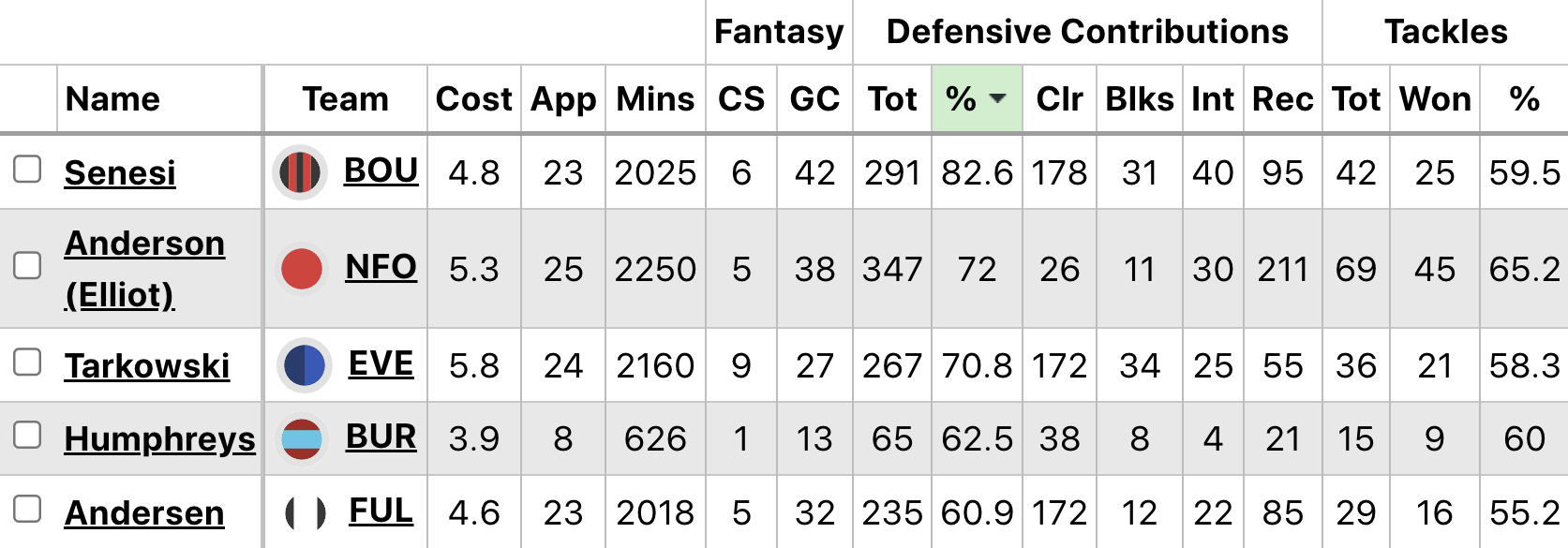 Above: Players sorted by DefCon success rate (%) in 2025/26 (min 500 mins)
