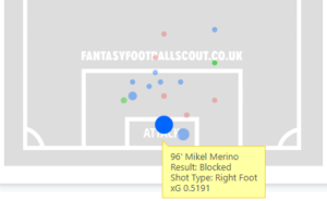 But until the 96th-minute, xG-boosting double chance for Riccardo Calafiori (£5.8m) and Mikel Merino (£5.9m) (the two big blue circles in the six-yard box below), the hosts did their best to restrict gilt-edged, close-range openings.