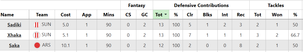 Above: The players gaining DefCon points on Wearside on Sunday. Xhaka and Sadiki also picked up their fourth bookings of the season, however.