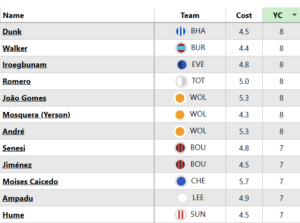 “Hang on”, you might be thinking. “Wasn’t Yerson Mosquera (£4.3m) on nine bookings this time last week?” That he was, but it has since transpired that he did not get booked in Gameweek 24 (despite what the FPL total says) and he remains on eight cautions.